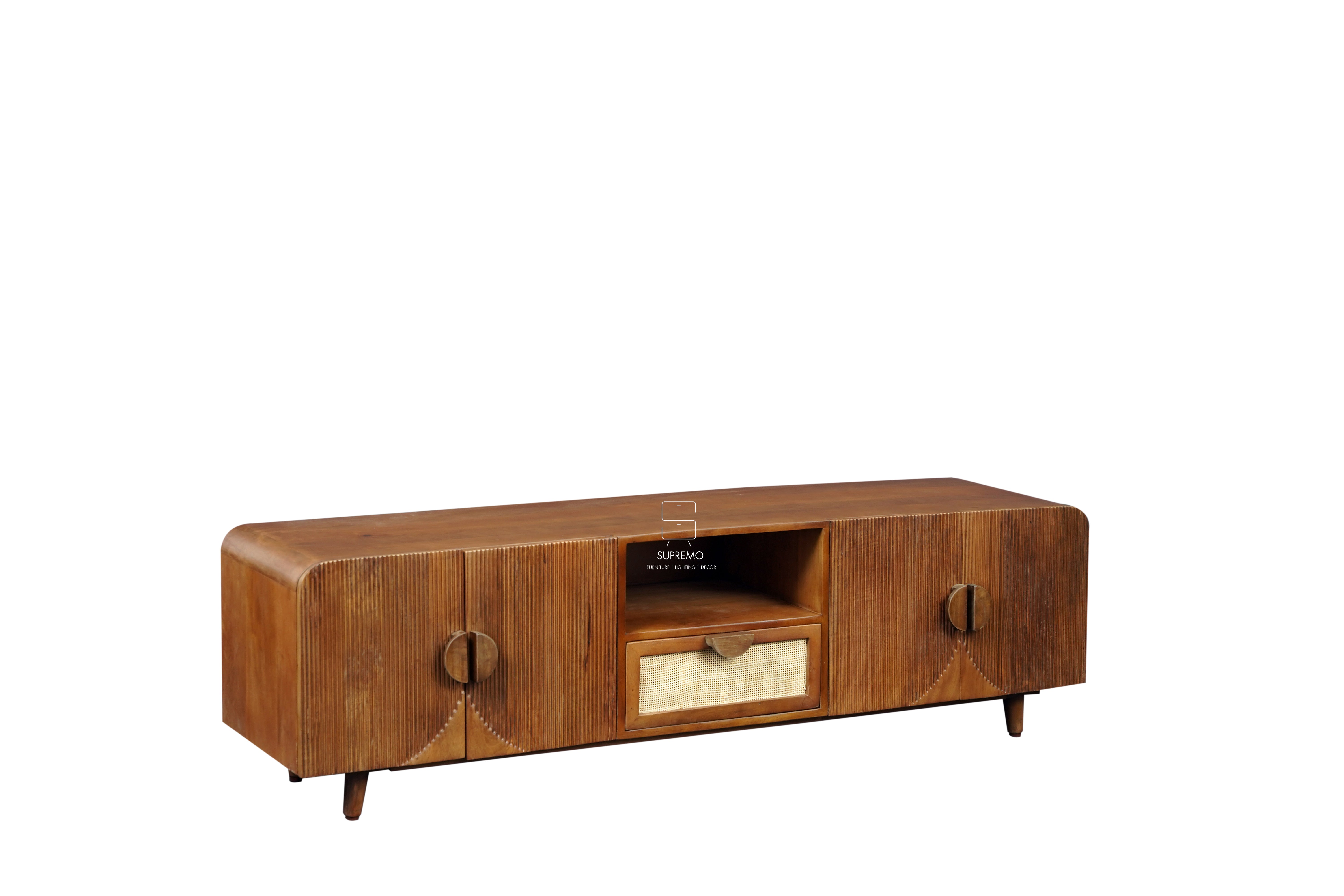 The Canopy Screen TV Console combines functionality with style. Crafted from mango wood and featuring a stain finish, this console adds a touch of rustic elegance to any living room. Its spacious shelves and sleek design make it perfect for displaying your television and media accessories while keeping your space organized and clutter-free.