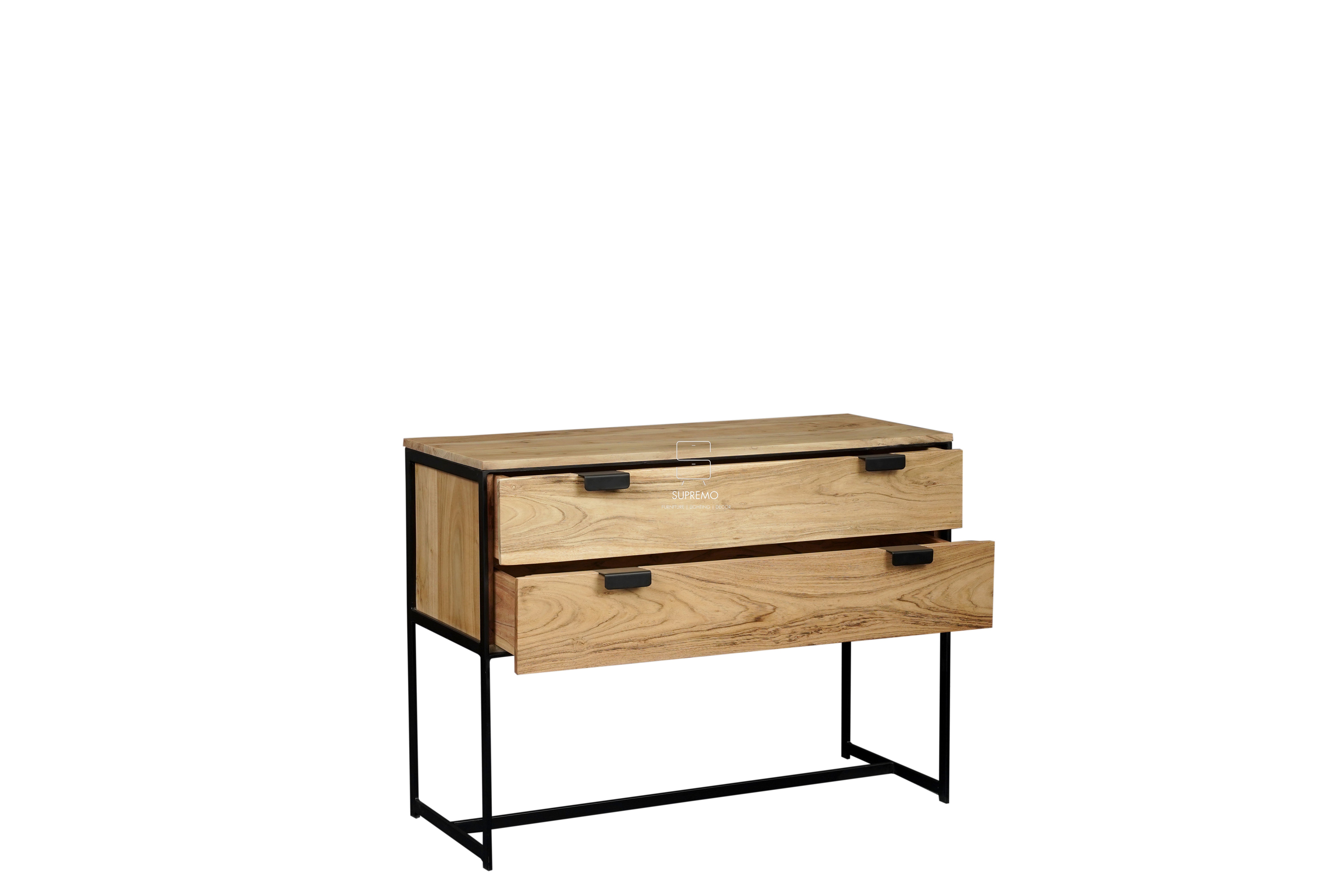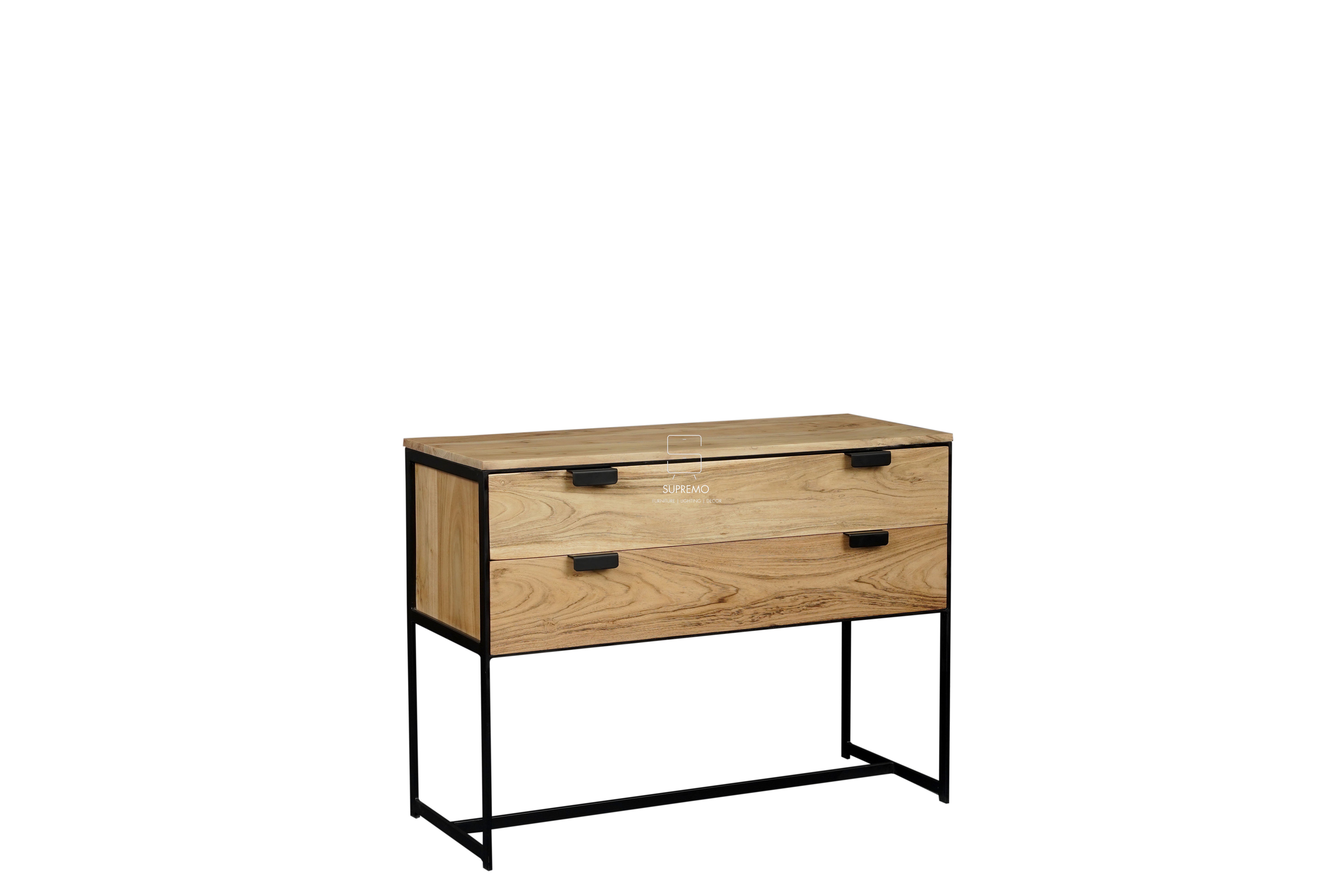 A rustic yet industrial console table with two drawers, blending acacia wood and metal for a modern or traditional setting.