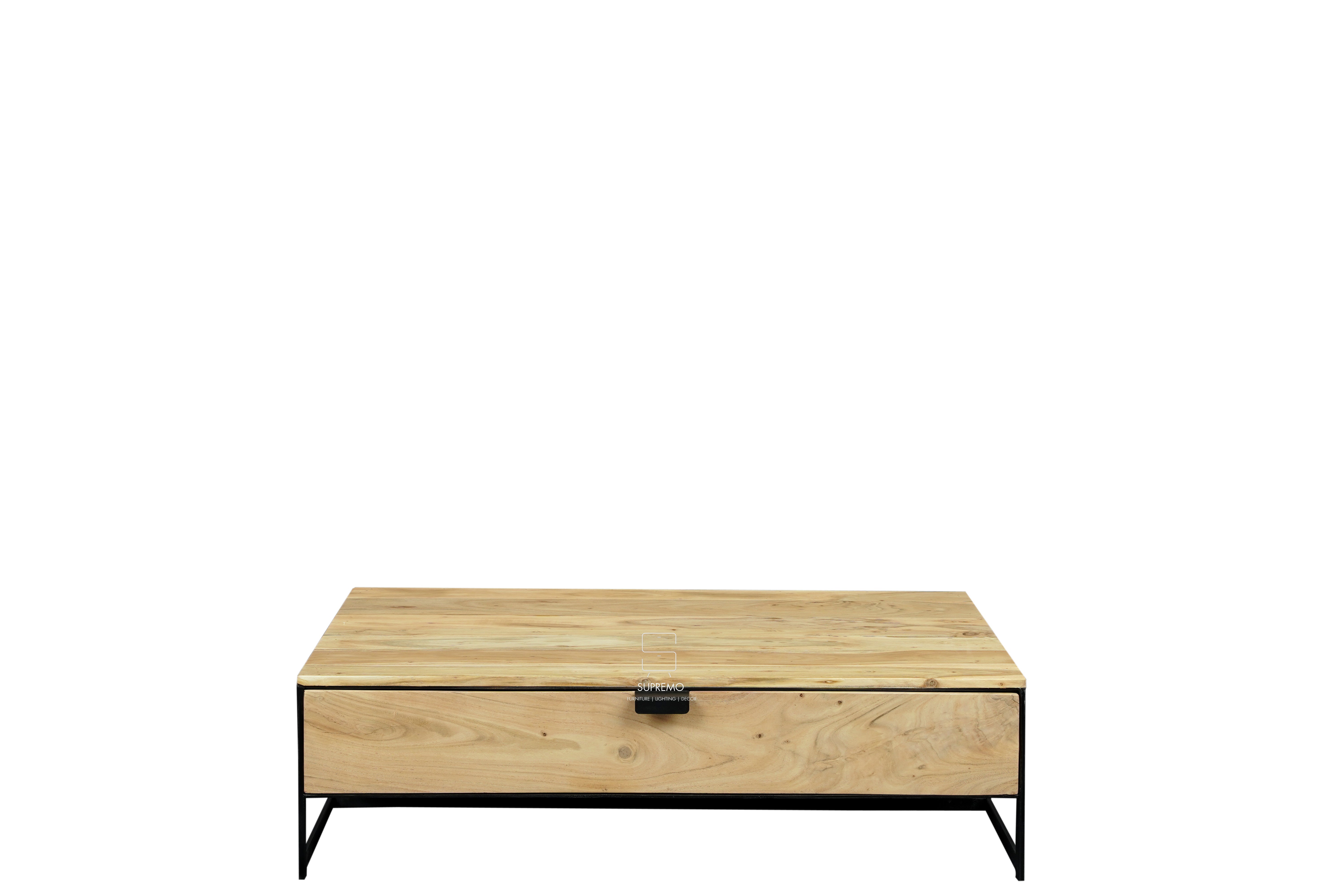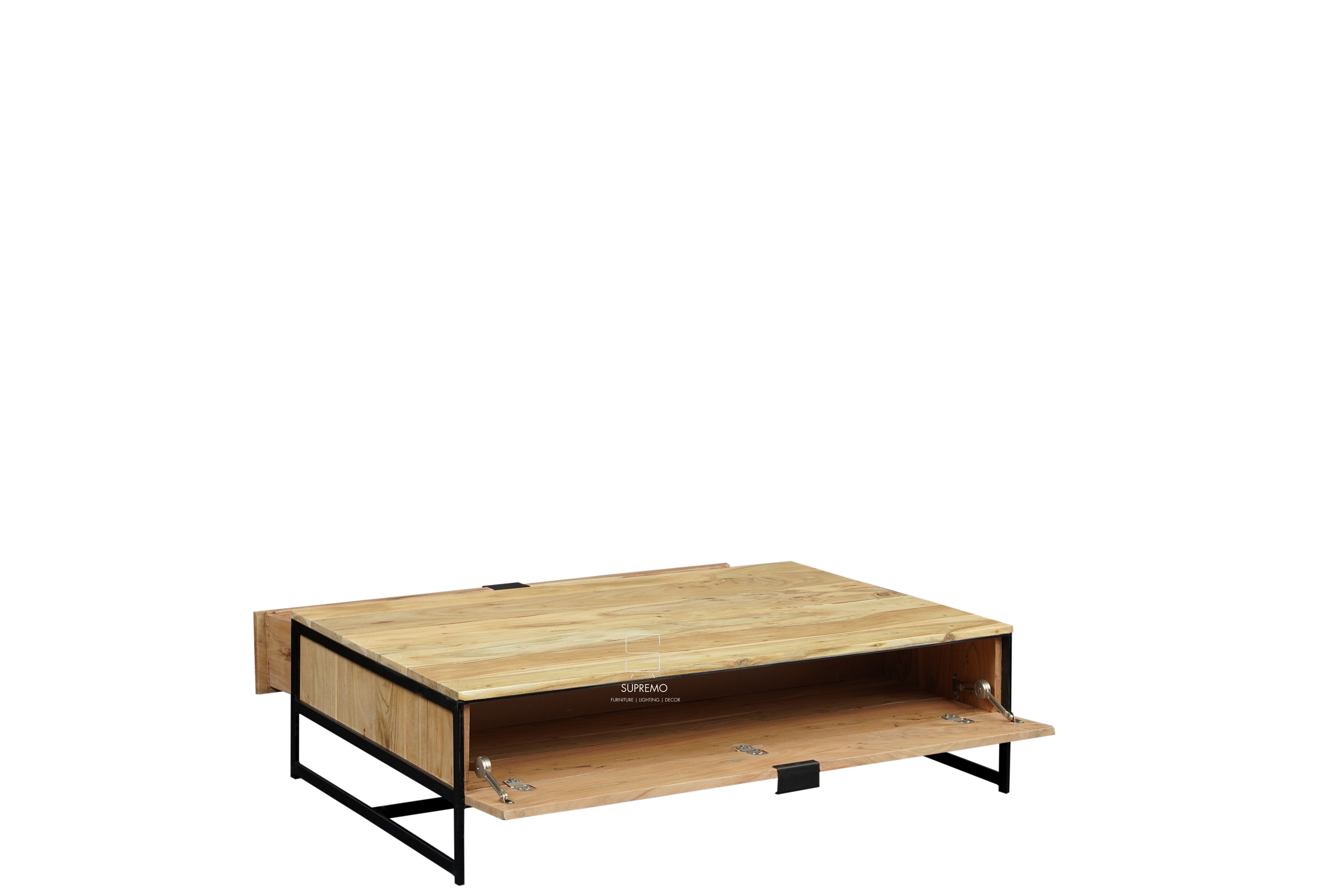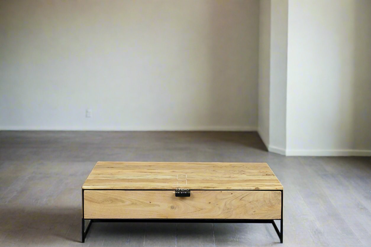 A coffee table featuring a unique blend of iron and acacia wood, with a door and drawer for storage, marrying industrial design with functionality.