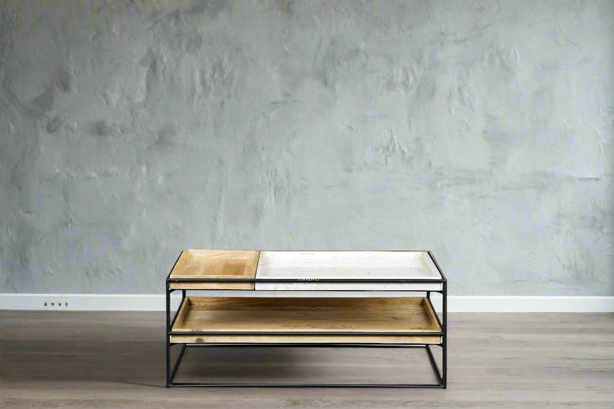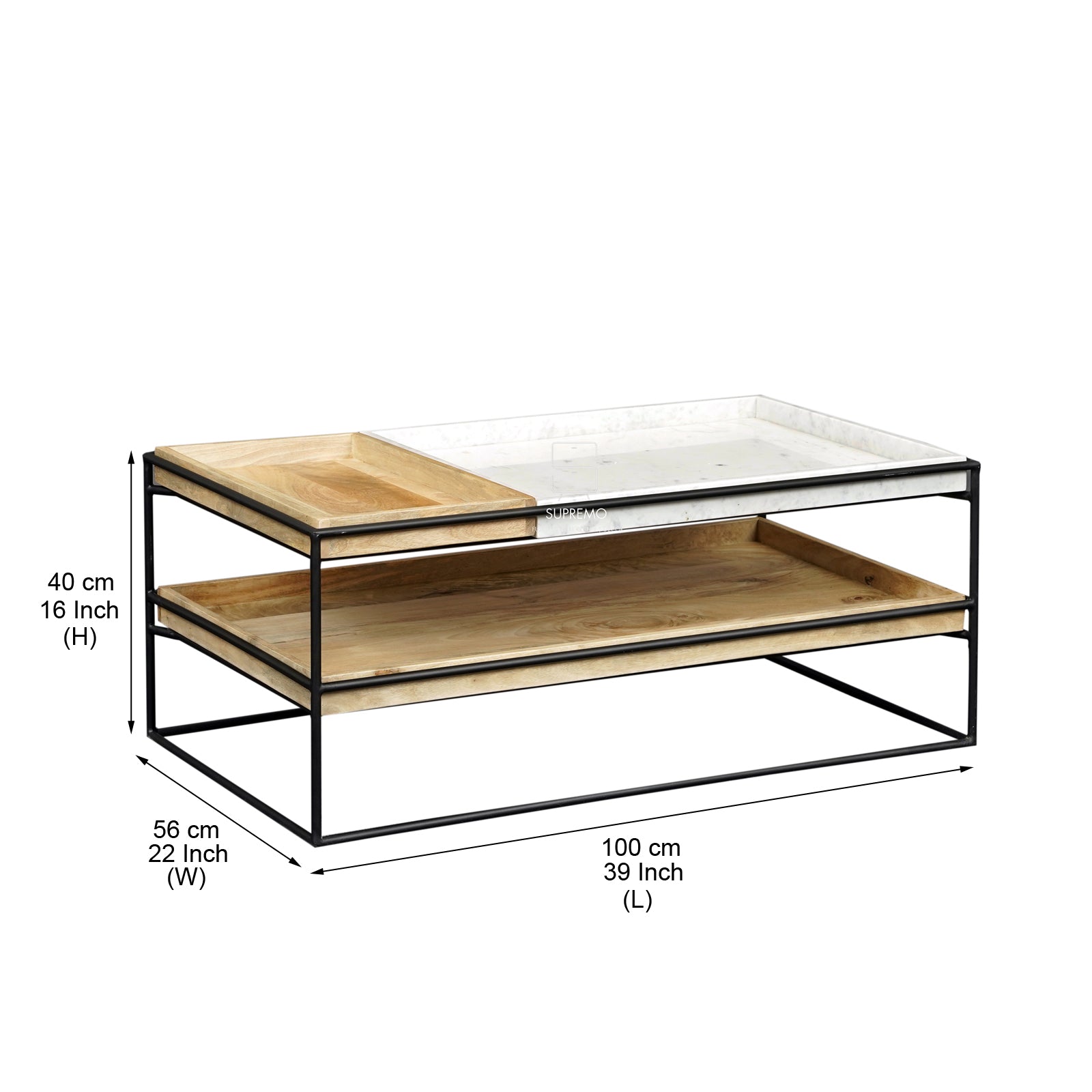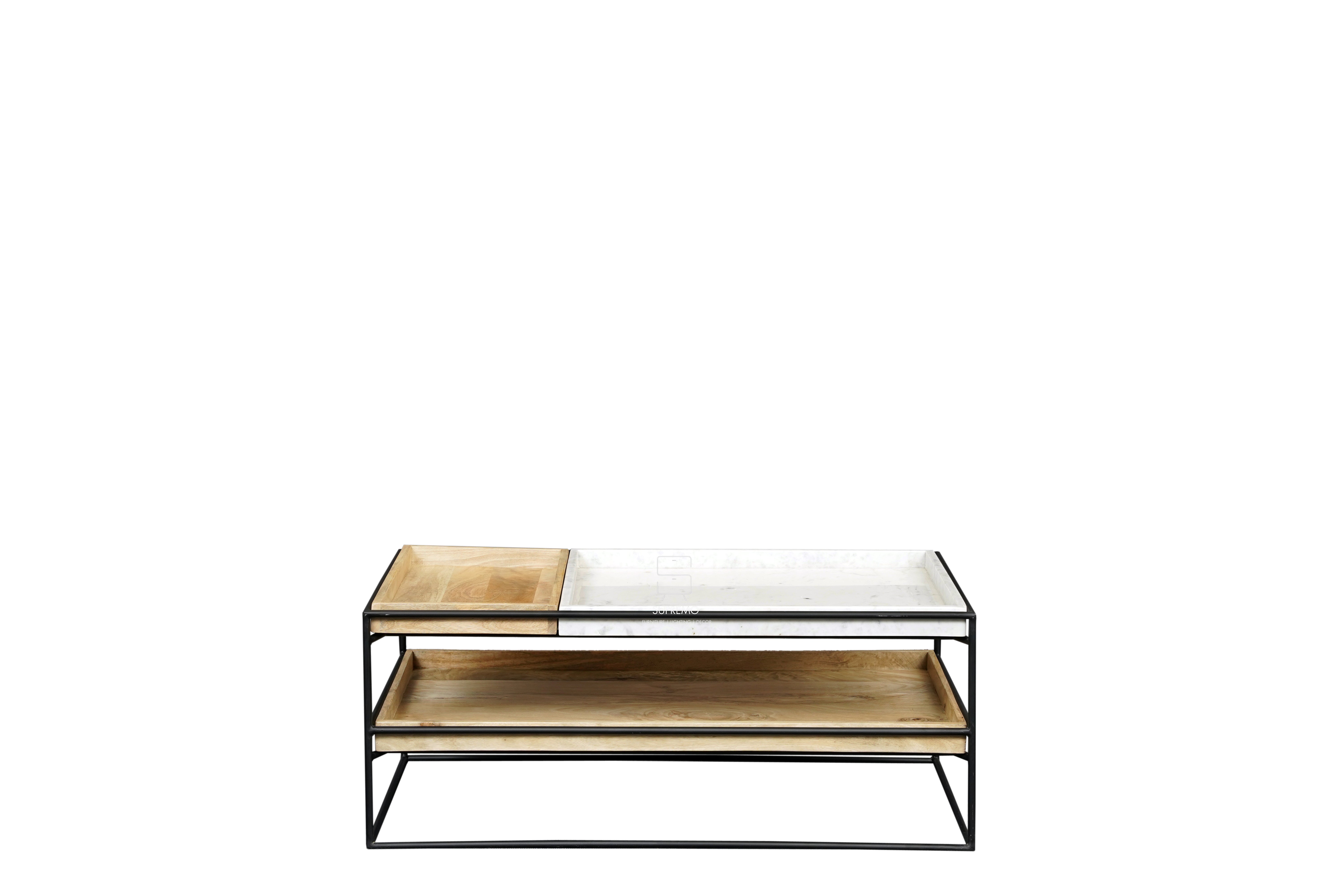 A luxurious coffee table featuring a trio of materials: metal, mango wood, and Baswara marble, offering a sophisticated and elegant centerpiece for any room.