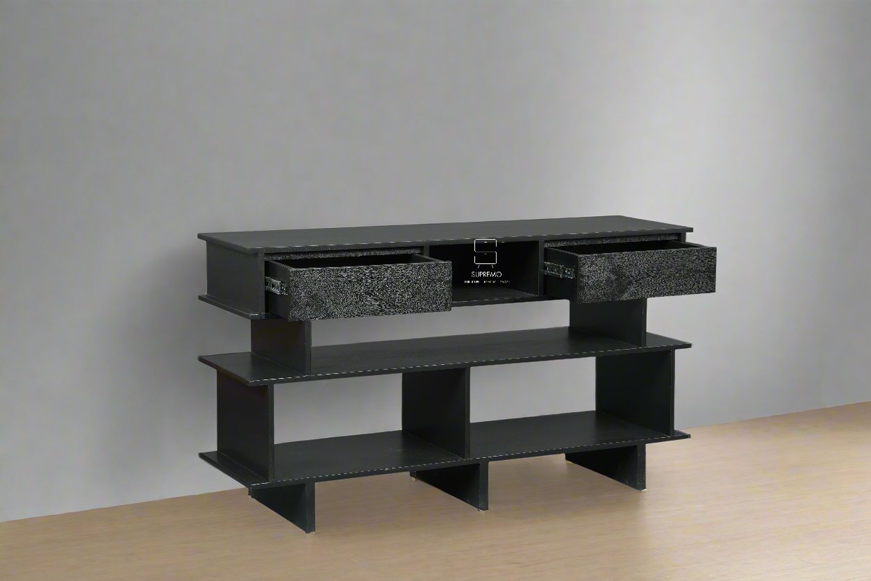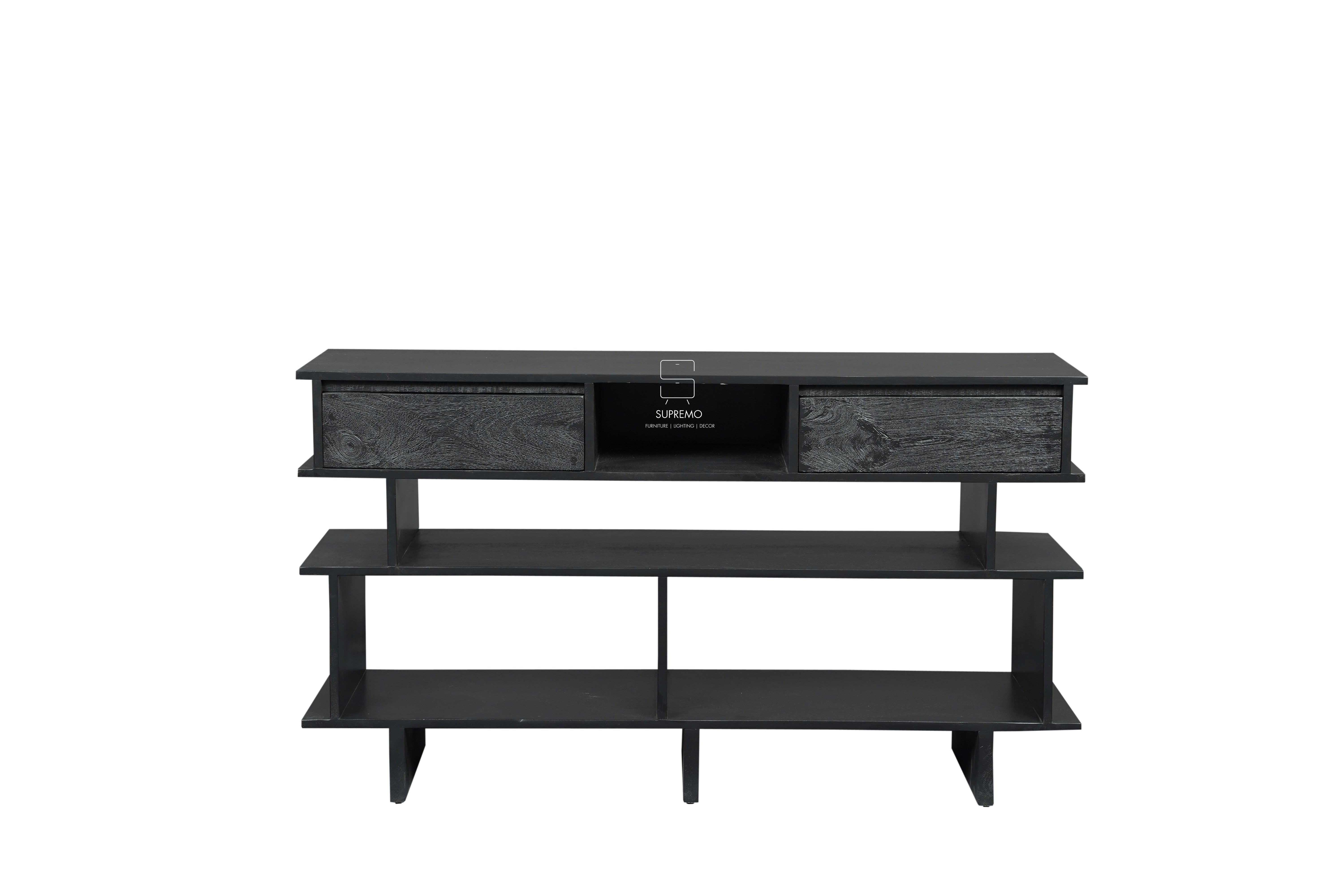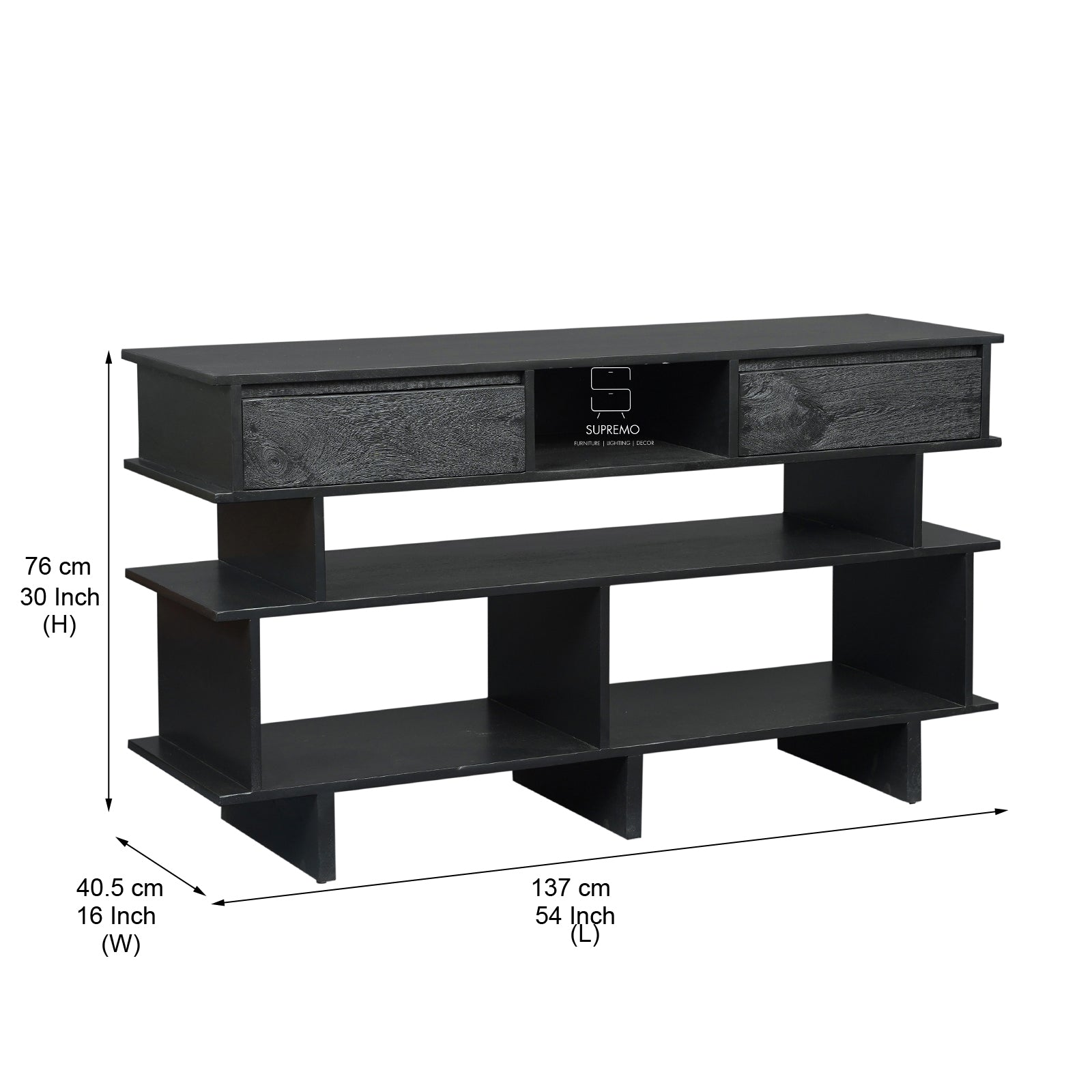 An elegant console table featuring two drawers for storage, crafted from rich mango wood with a sleek black finish. Ideal for an entryway or living room.