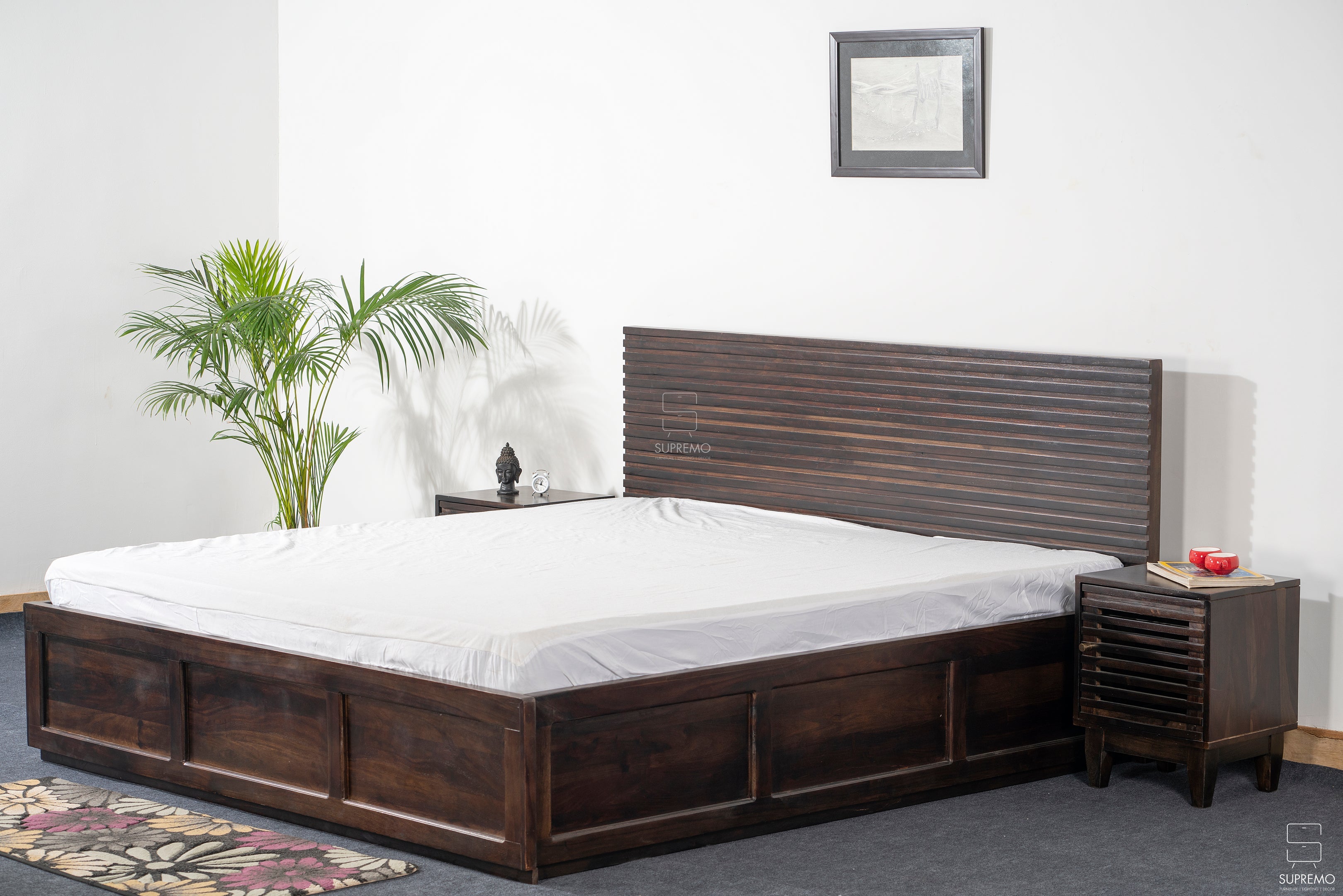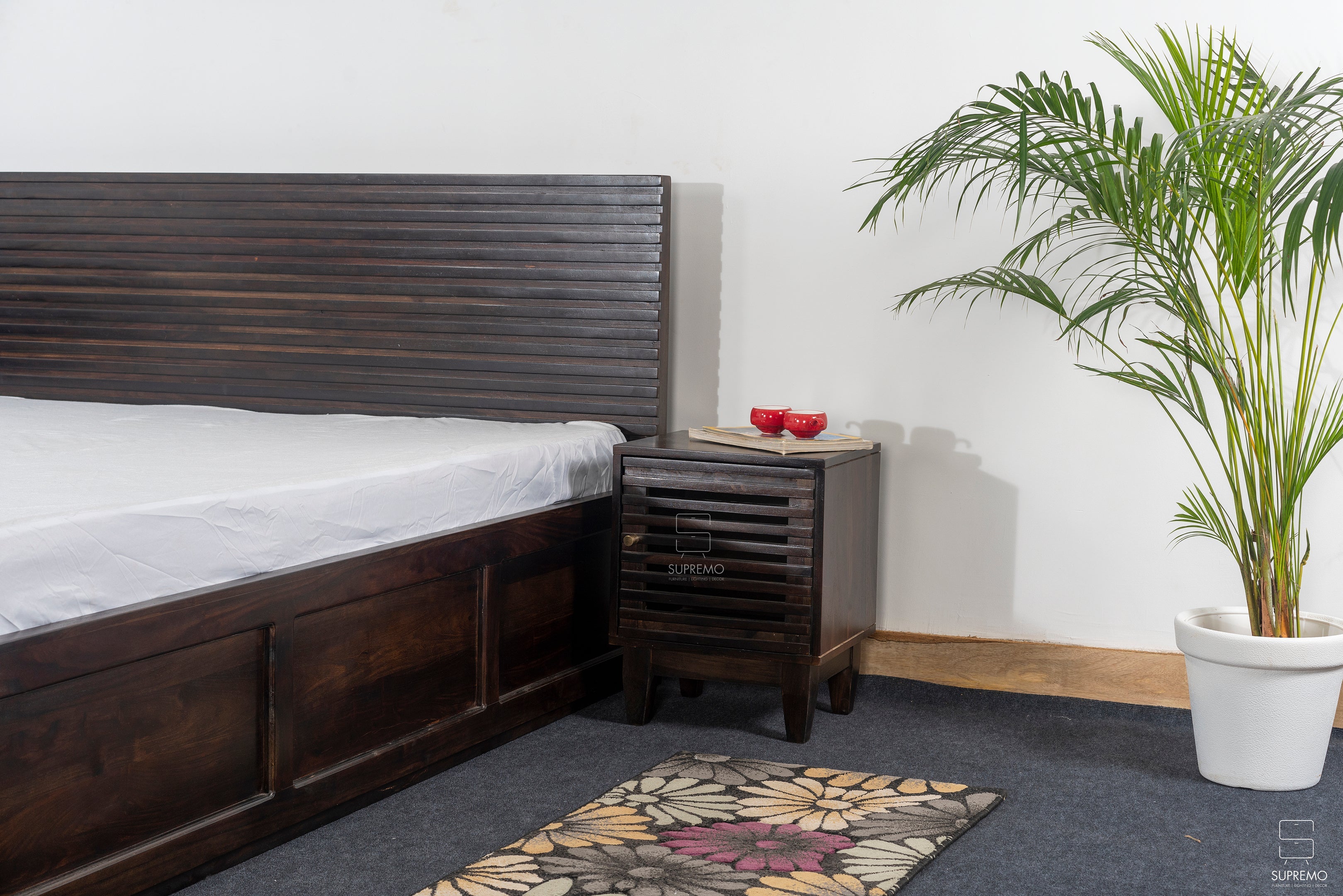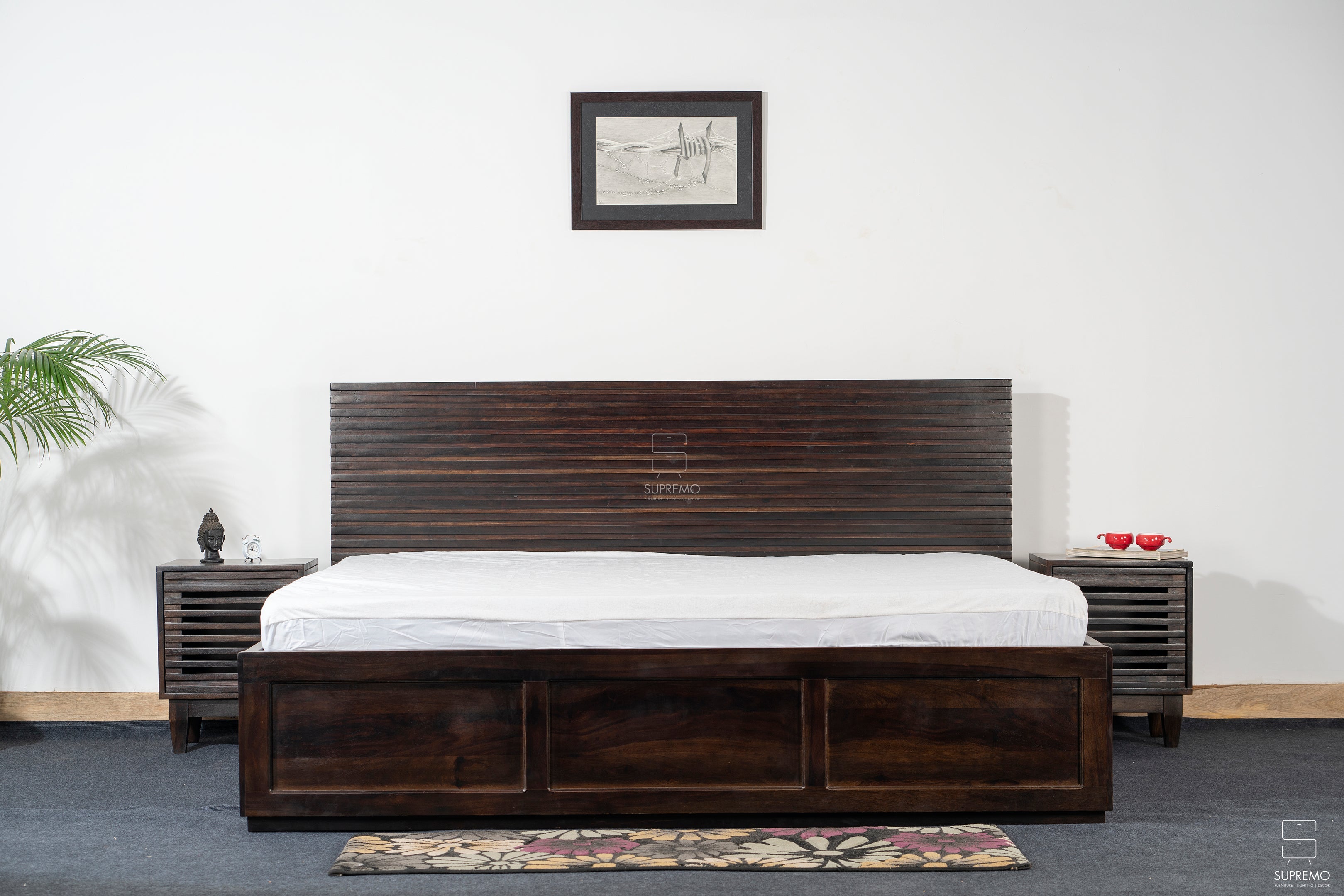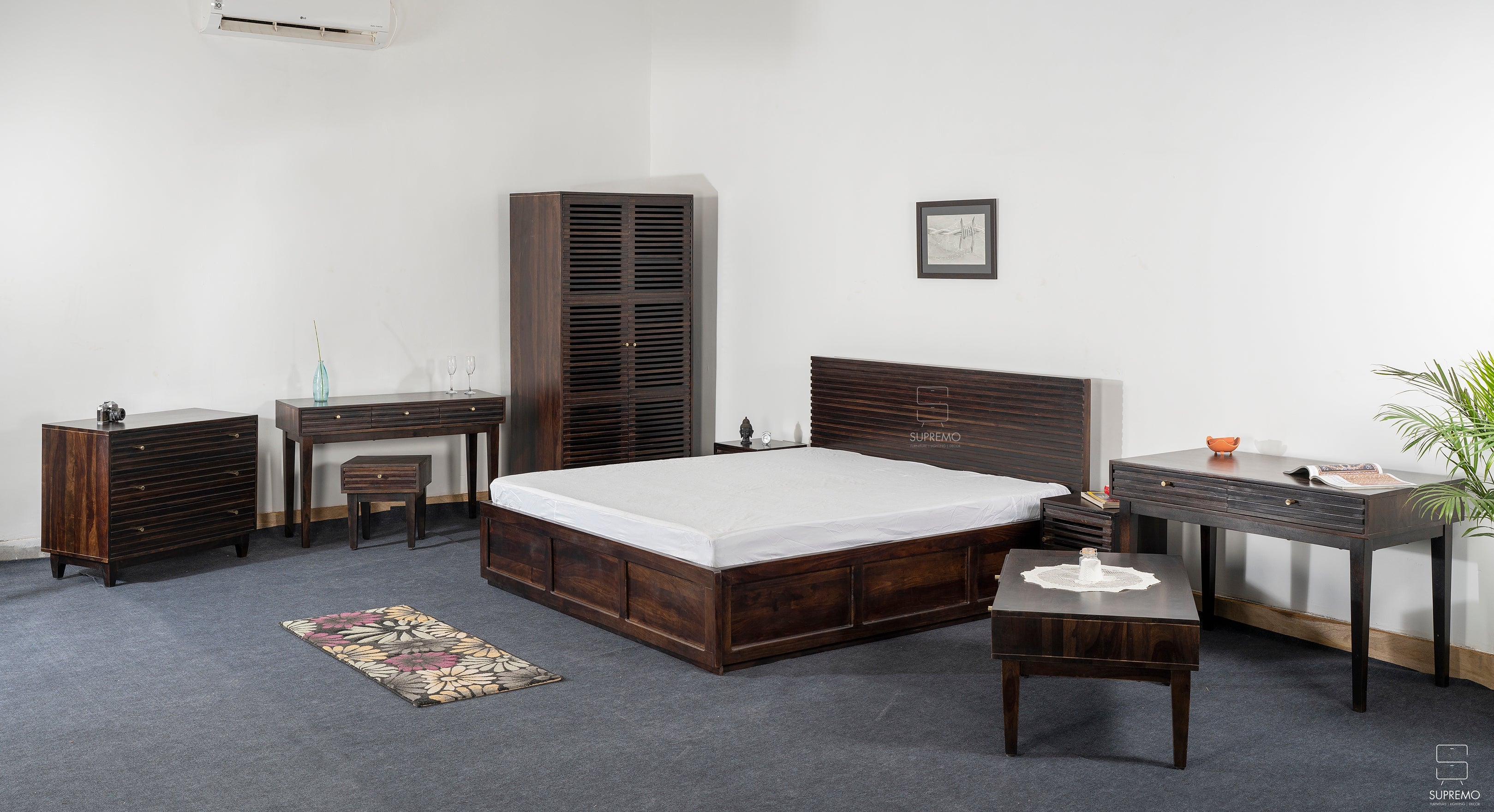 The "Zenith Slats Series" is the embodiment of timeless design reimagined for modern living. Each piece, adorned with elegantly crafted slats, draws inspiration from the linear grace of contemporary architecture, offering a clean and cohesive aesthetic. The dark, rich tones of the wood lend a grounded, earthy feel, while the repetitive slatted motif provides a soothing sense of order and sophistication. This series is not just about form and function—it's about creating a tranquil backdrop for everyday life, reflecting the quiet luxury of simplicity.